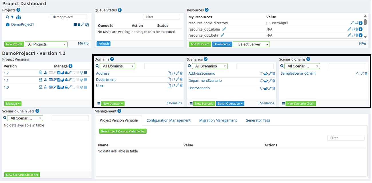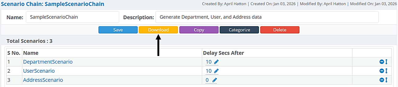 A Scenario Chain (called SampleScenarioChain) has been created and contains all three Scenarios with a 10 second delay after running both the DepartmentScenario and UserScenario scenarios.