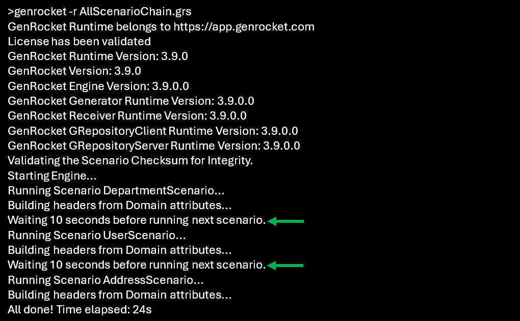 - For this example, three Scenarios are run when the Scenario Chain is run. GenRocket Runtime will wait 10 seconds after running the Department Scenario and then 10 seconds after running the UserScenario, as shown below: