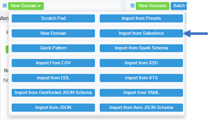 Once the Test Data Project and Salesforce Profile have been selected, you will be able to use the Import from Salesforce option within the New Domain menu. This option allows you to select the Salesforce Object and Fields to be imported into the Domain.