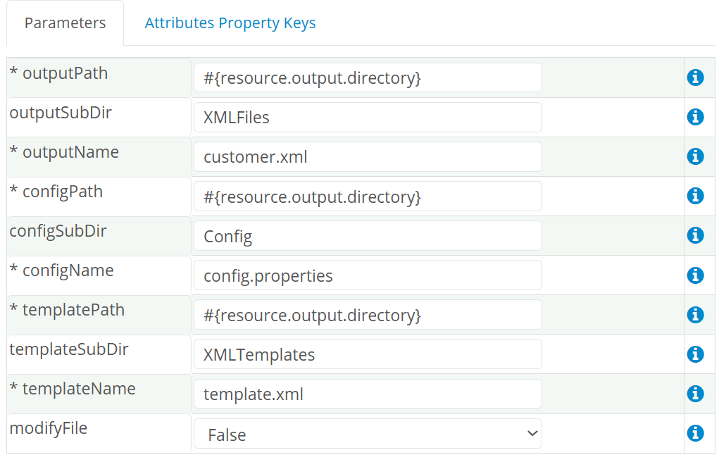 - modifyFile - If set to True, the XMLTemplateReceiver will read a file from the Output path and update the tags present in the defined BlockElement in file with attribute values. if set to False, the receiver will create a new file at the output location by reading a default Template file from the defined Template path.
