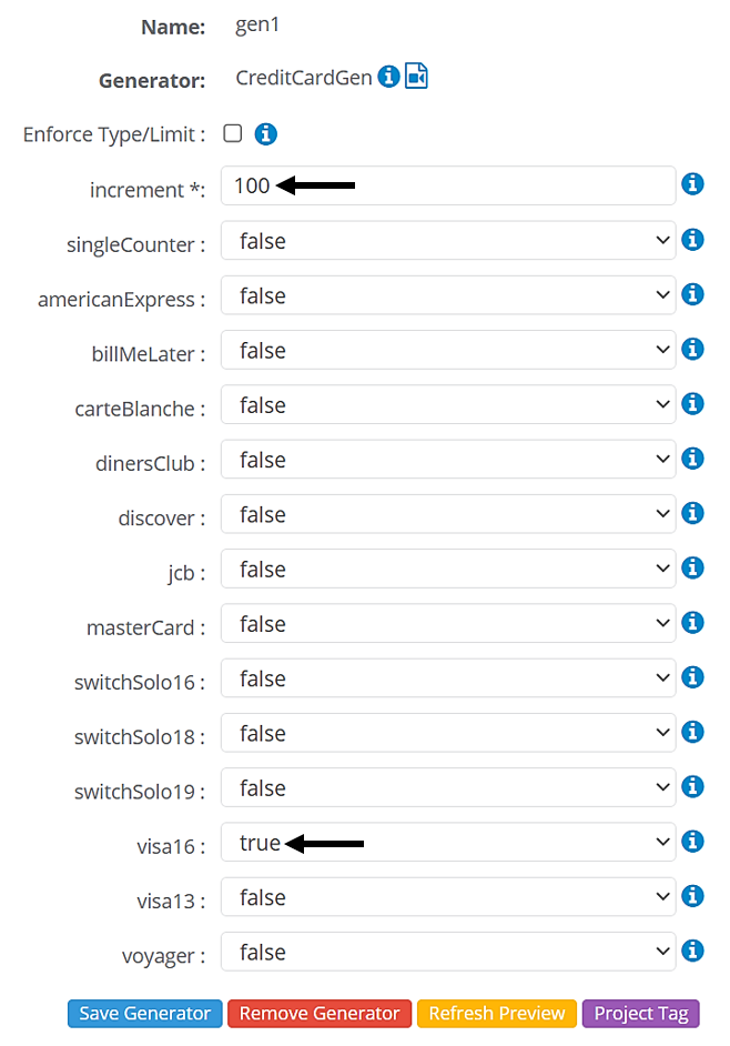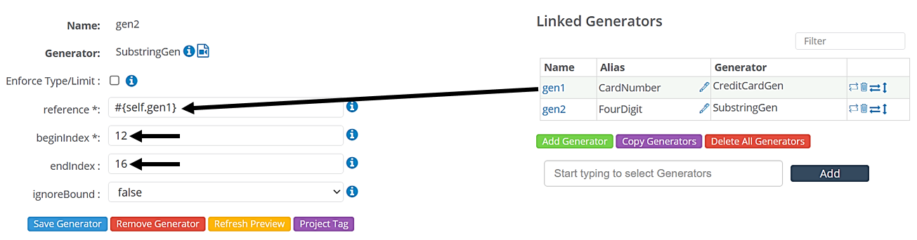 This example demonstrates the setup for the video example above. It will generate the last four digits of the referenced credit card numbers. Two generators, CreditCardGen and SubstringGen, will be linked in this example.