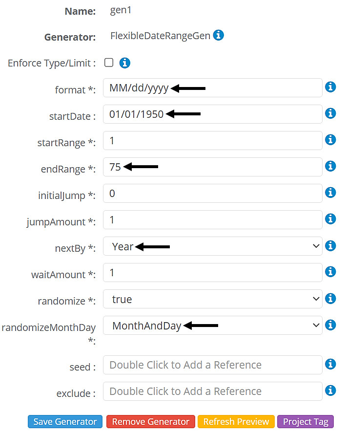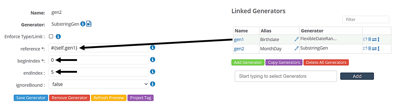 This example shows how to generate the birth month and day from a referenced birthdate. It will use the FlexibleDateRangeGen and the SubstringGen.