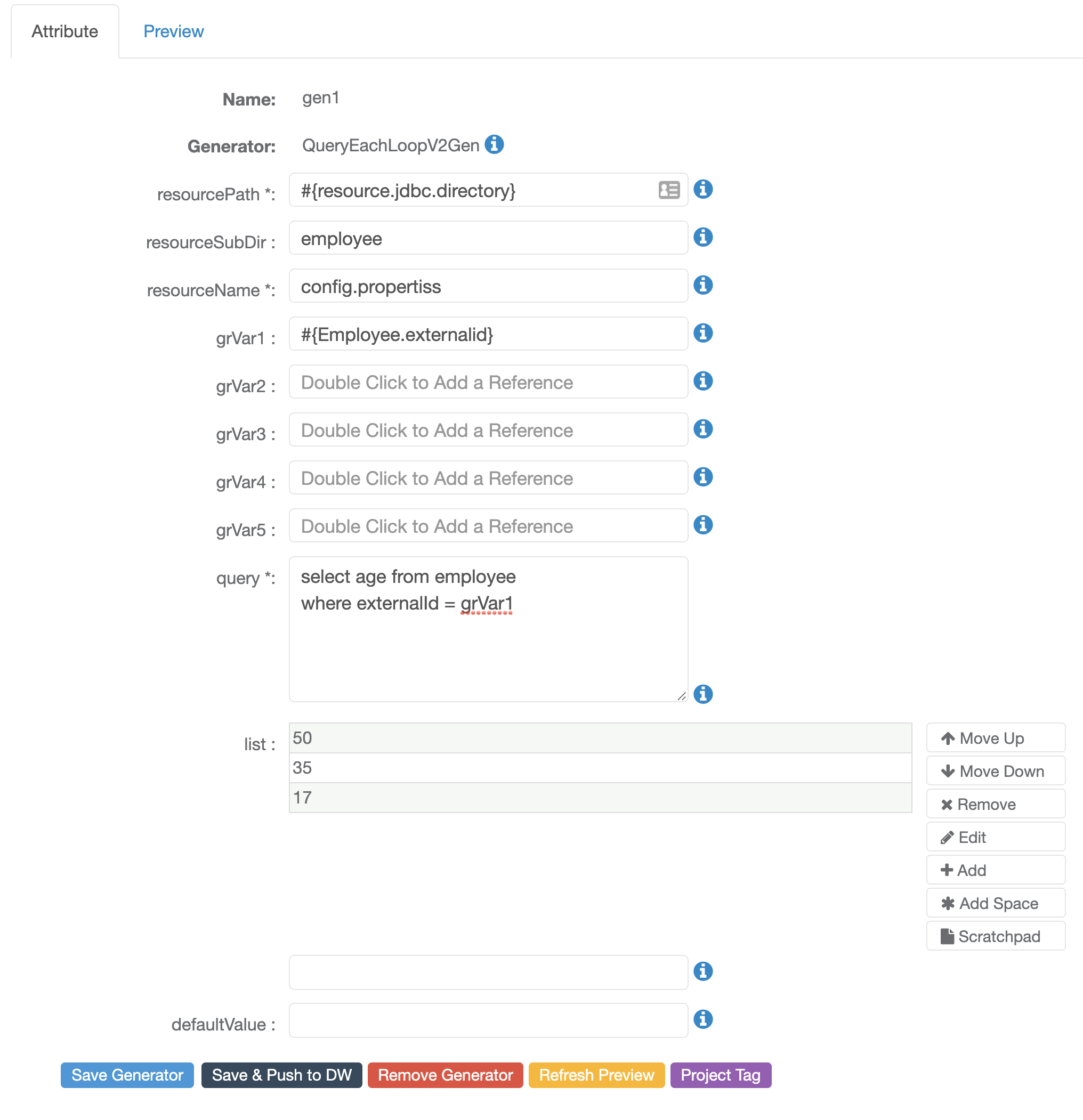 The externalId Attribute uses the QueryBeforLoopV2Gen Generator, and the image below shows the parameter configuration necessary for this example. For more information about this Generator, please see How Do I Use the QueryBeforeLoopV2Gen Generator.