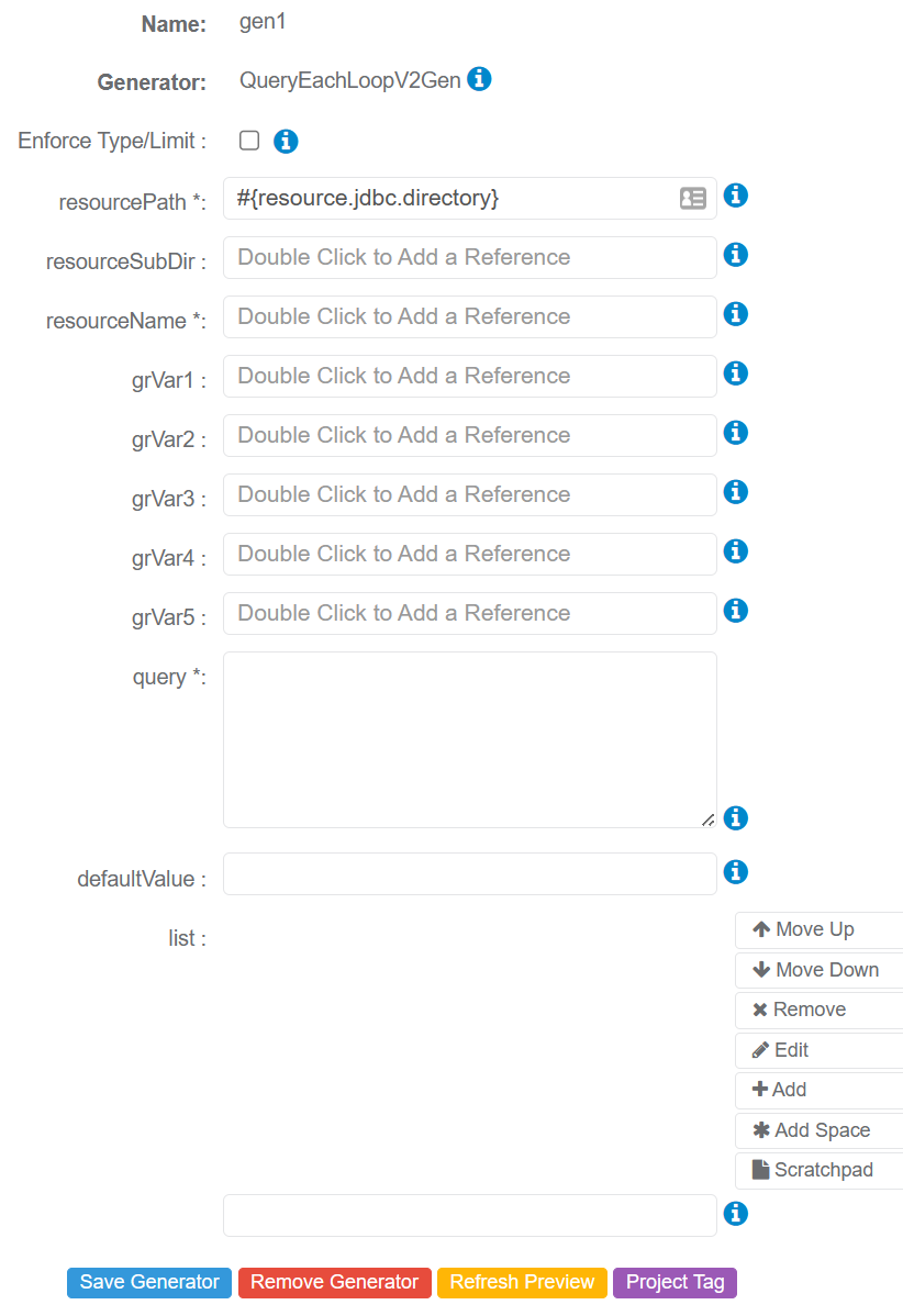 The following parameters may be configured for the QueryEachLoopV2Gen Generator. Items with an asterisk* are required.