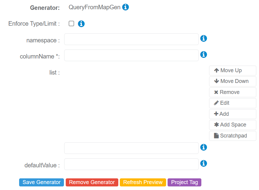 - columnName* - Defines the name of the column to map to within a given QueryToMapGen Generator.