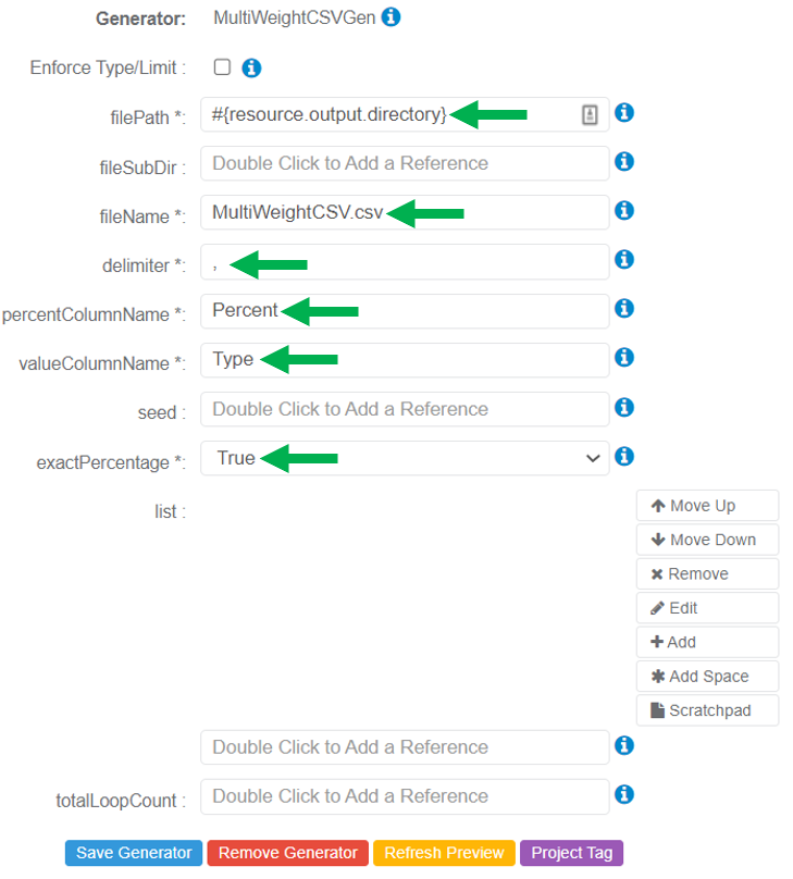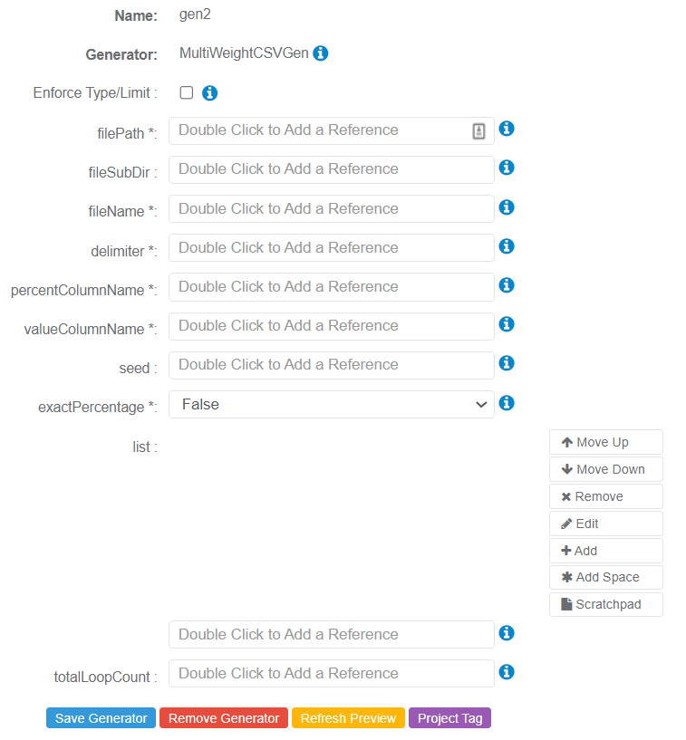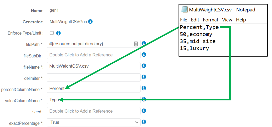 The following parameters may be configured for the MultiWeightCSVGen Generator. Items with an asterisk* are required.