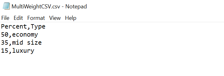 For this example, a CSV file will be used to determine the percentage of time three different car types are generated within the output. Based on the following CSV file, the following car types should be generated as follows:
