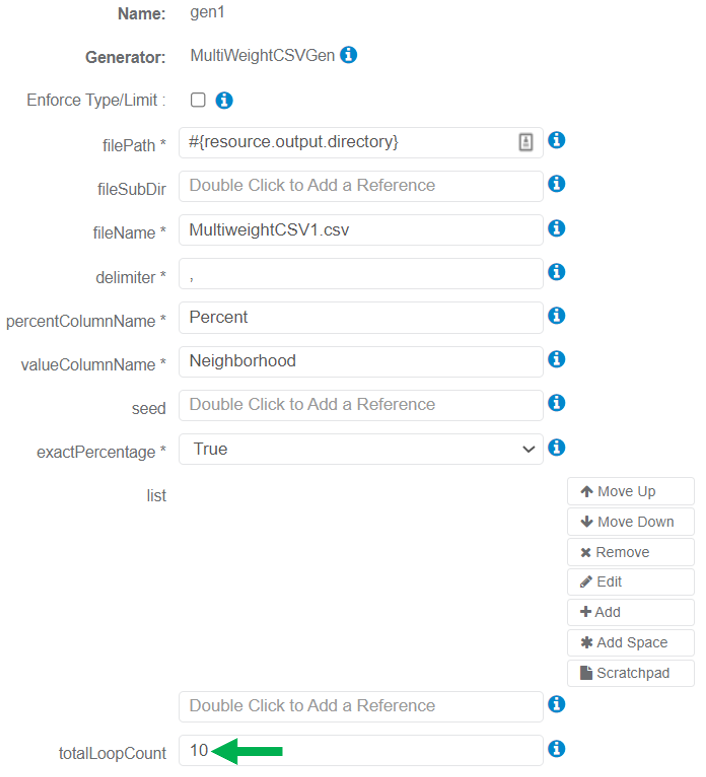 This parameter should be used when data is generated dynamically (i.e., randomly) for a child. For example, a user has many addresses based on defined logic. In this instance, the Scenario does not know the total loop count in advance, and the MultiWeightCSVGen Generator does not work to divide the percentage properly.