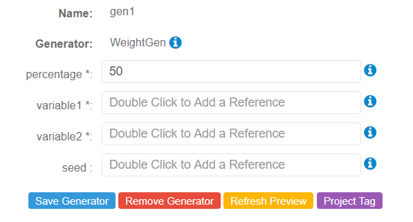 The following parameters may be configured for the WeightGen Generator. Items with an asterisk* are required.