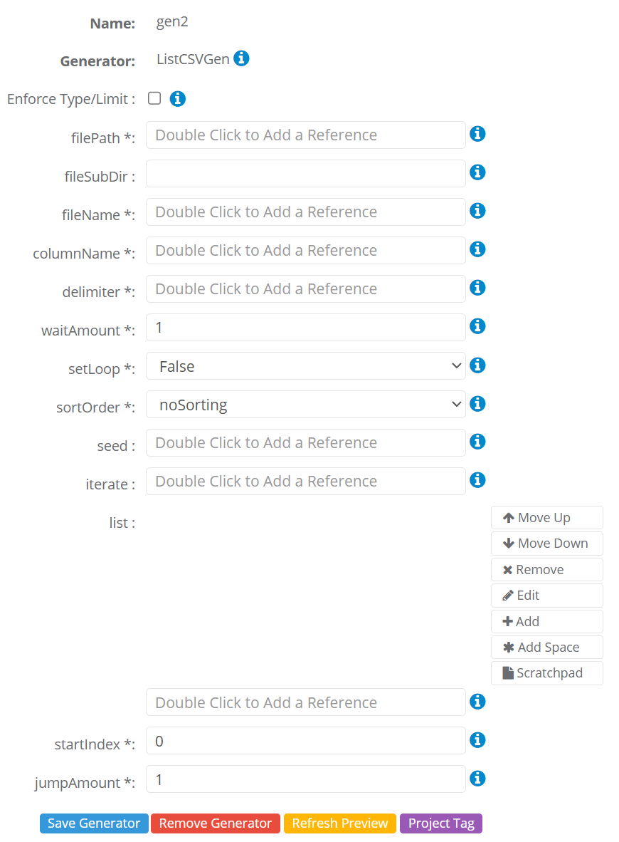 The following parameters may be configured for the ListCSVGen Generator. Items with an asterisk* are required.
