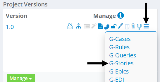 The G-Stories Management Dashboard is used to define, organize, and maintain suites of Test Data Stories or G-Stories. Users can create and manage stories for the selected Project Version within the dashboard.