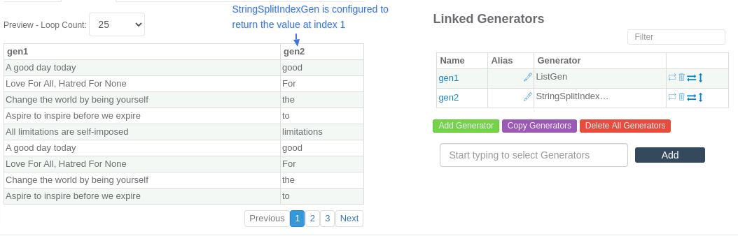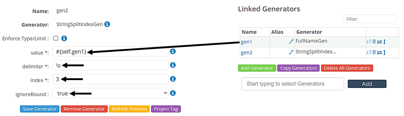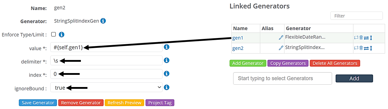 - value* - Defines a reference to another Attribute or a reference to a Generator in linked Generators. It can also be a constant string. It is the String that the Generator splits based on the delimiter specified by the User.