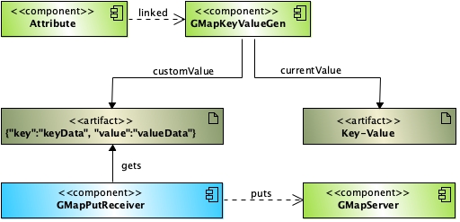 The component diagram below shows how the GMapPutReceiver interacts with a GMapKeyValueGen and a G-MapServer.