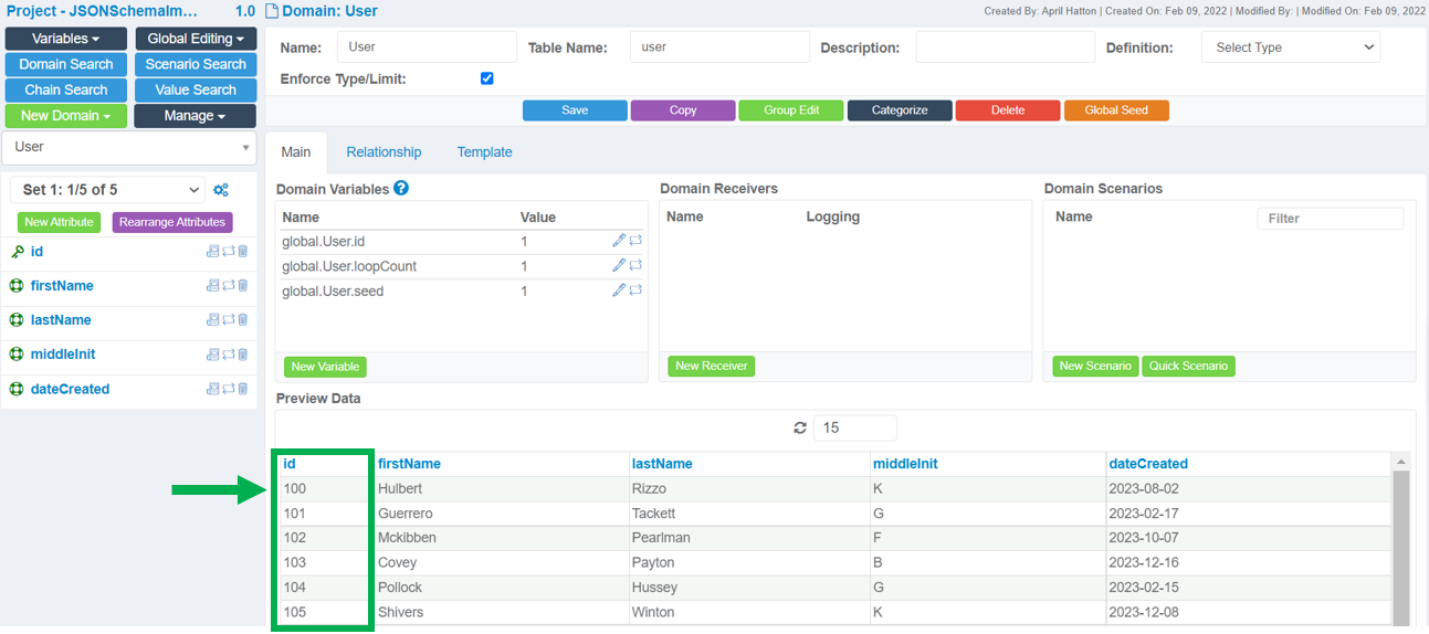 The User Domain contains the five Attributes defined within the JSON Schema file used for the import.
