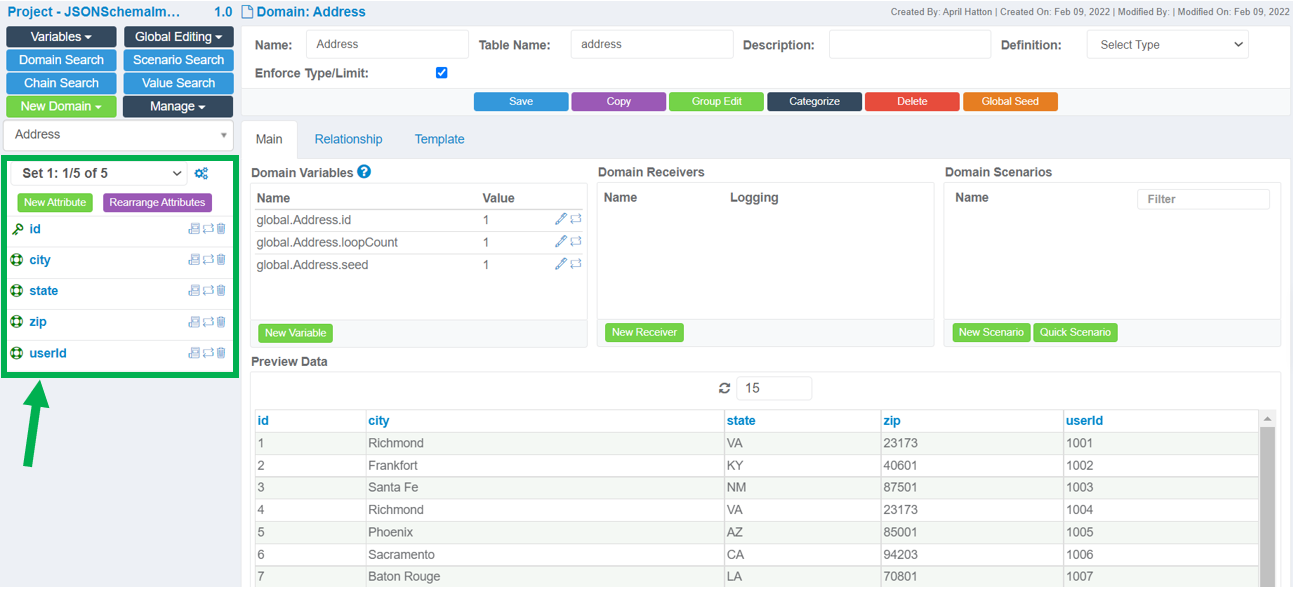 The Address Domain contains the five Attributes defined within the JSON Schema file used for the import.