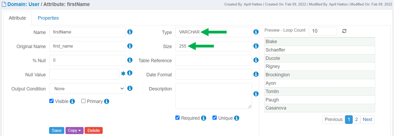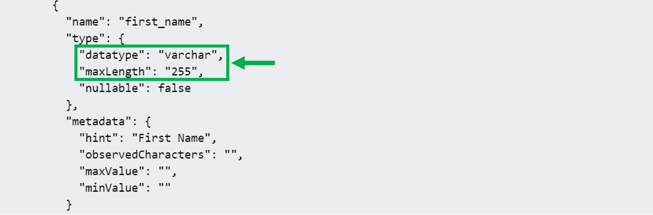 Below is the portion of the file that defines the firstName Attribute for the User Domain. The Data Type and Max Length information can be seen in the Attribute Dashboard.