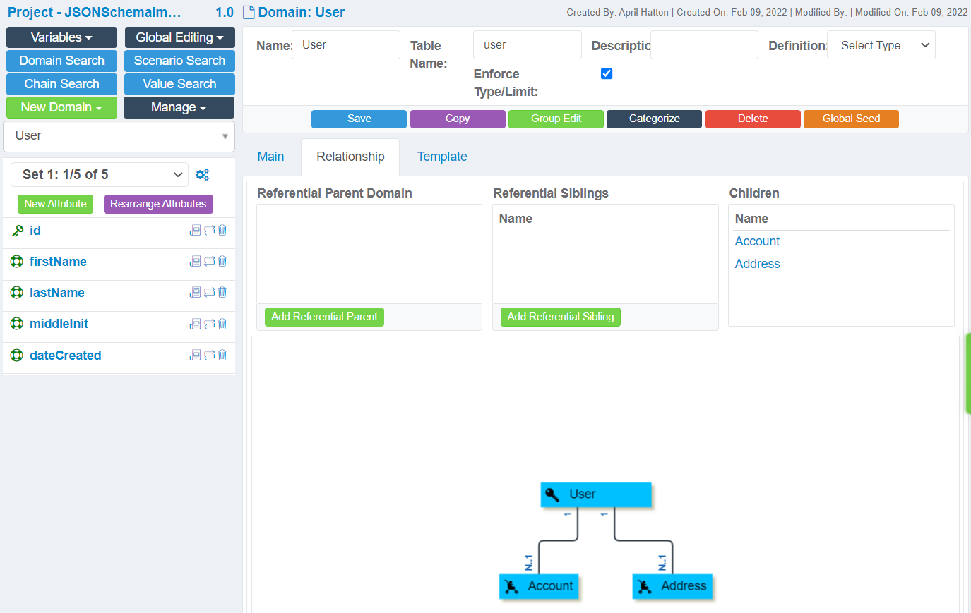 The User Domain is the Parent of the Address and Account Domains. For each Domain, the id Attribute is the Primary Key.