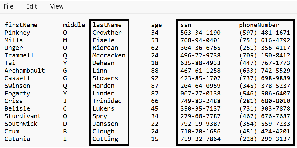 Three values will be masked within the source file: lastName, ssn, and phoneNumber (shown below).