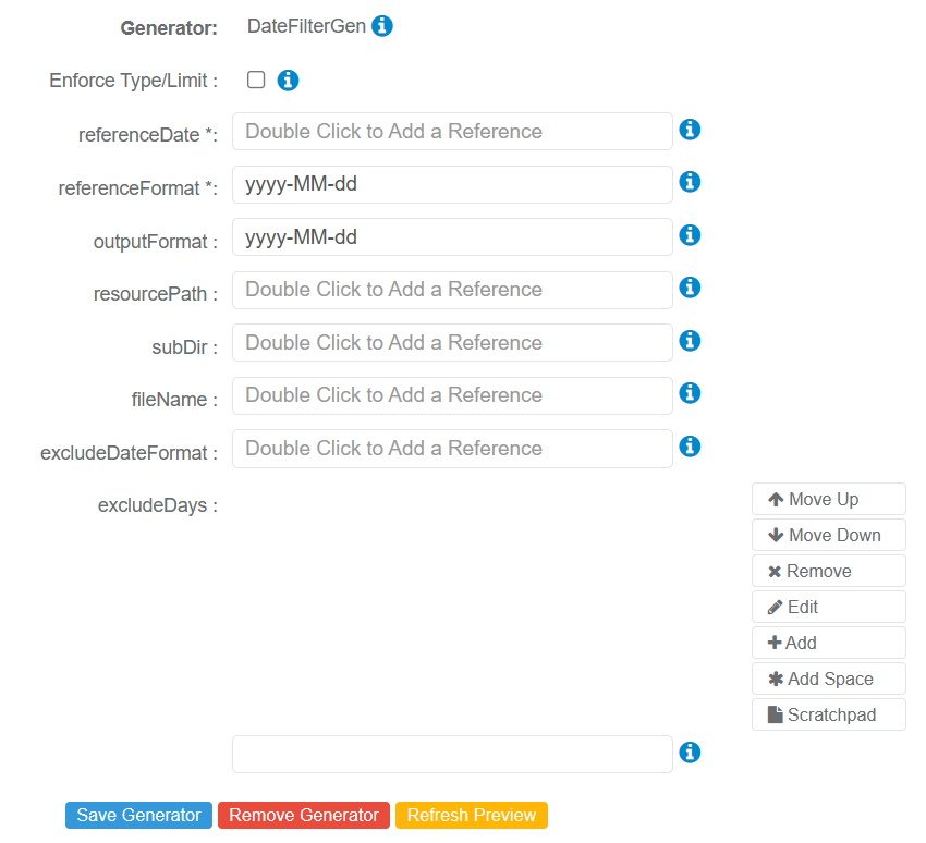 The following parameters may be configured for the DateFilterGen Generator. Items with an asterisk* are required.