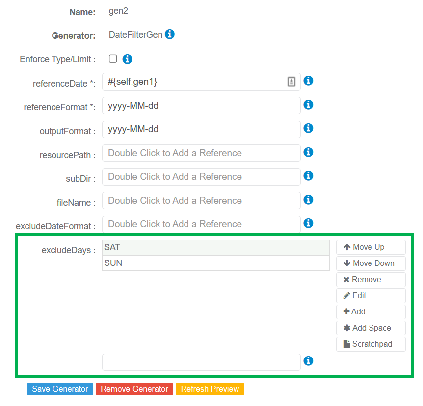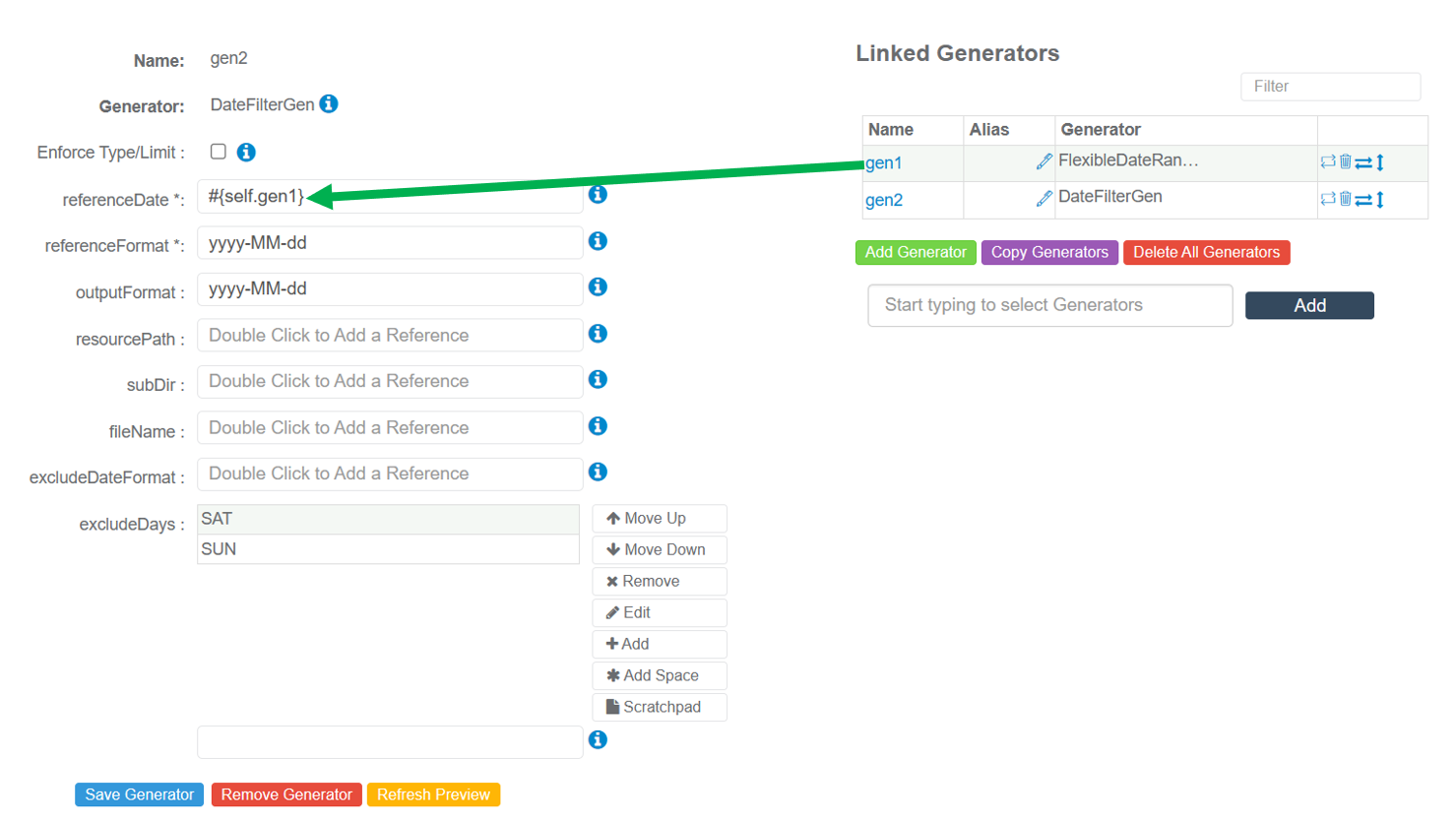 The DateFilterGen will reference the FlexibleDateRangeGen and exclude all Saturdays and Sundays from the generated output.