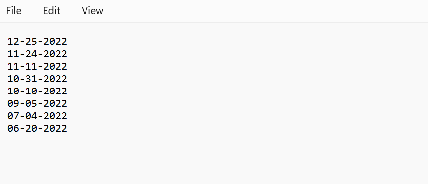 The following text file contains the dates that should be excluded from the generated dates: