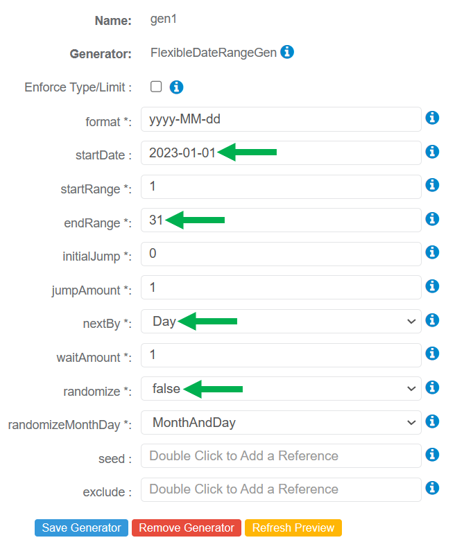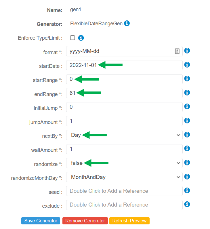 - referenceDate* - Reference a date to be checked for exclusion during test data generation (based on configured exclude options).