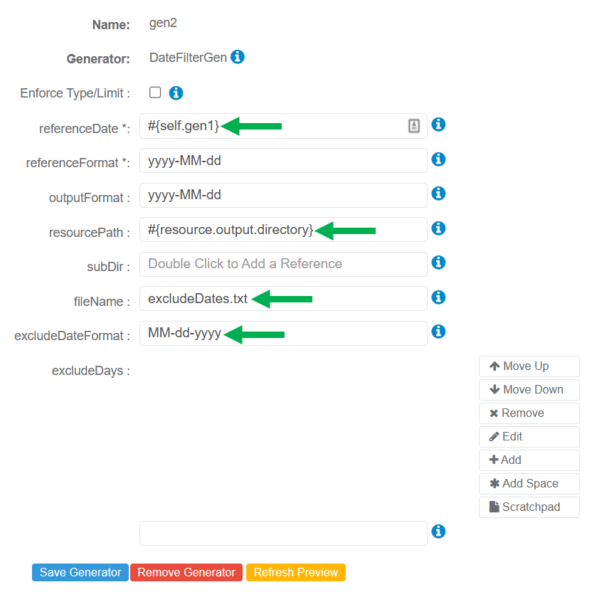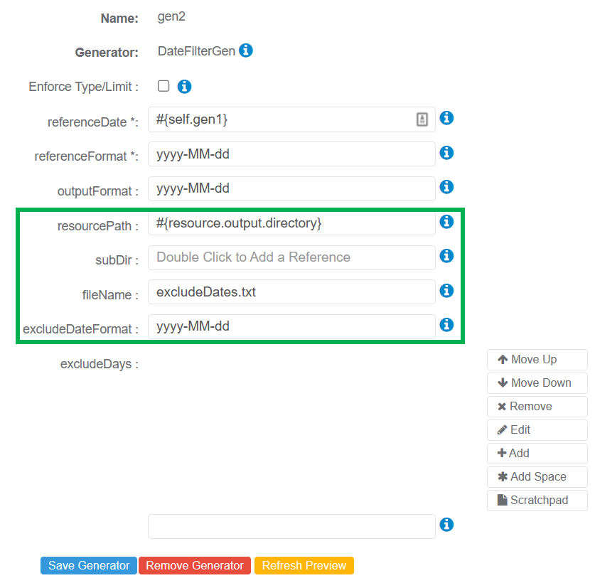 The DateFilterGen Generator can be used to filter out generated dates based on the configured exclude conditions. Two exclude options are provided for filtering dates (Filter by Dates or Filter by Days). At least one must be configured.