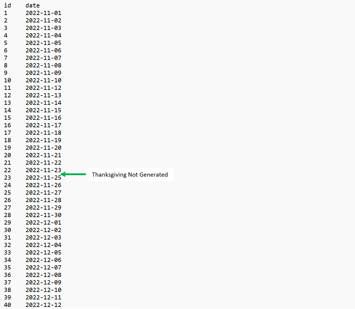 For this example, dates have been generated for November and December 2022.