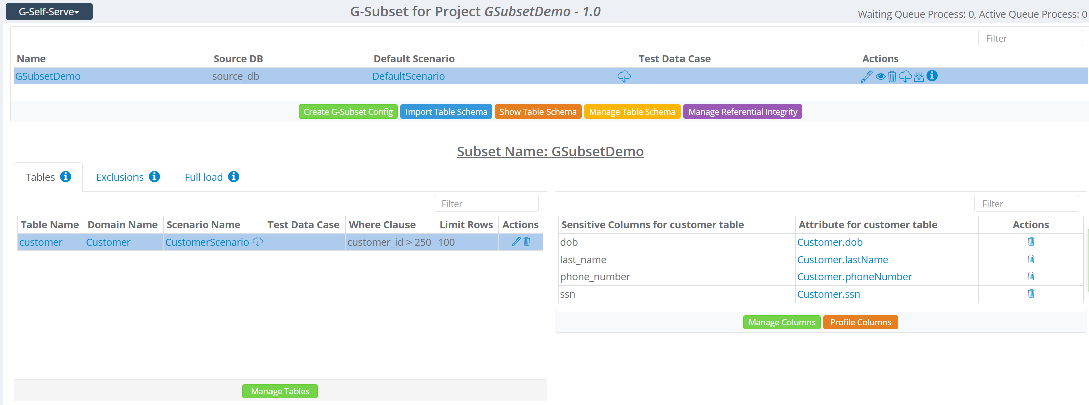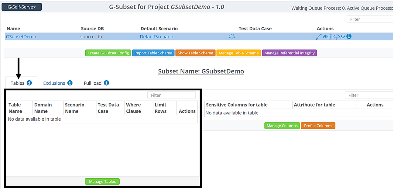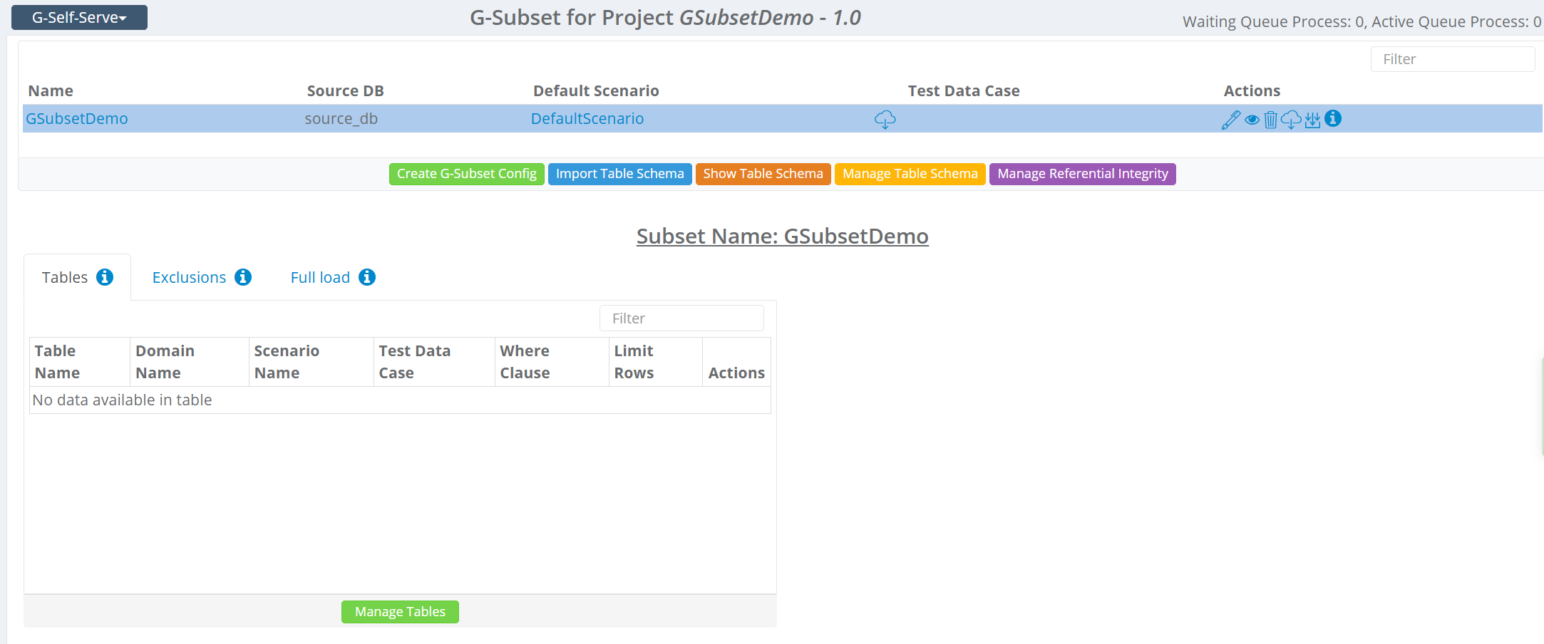 This tab will appear as shown below after a G-Subset configuration has been created. Please note that tables will not be available for selection until a table schema has been imported.