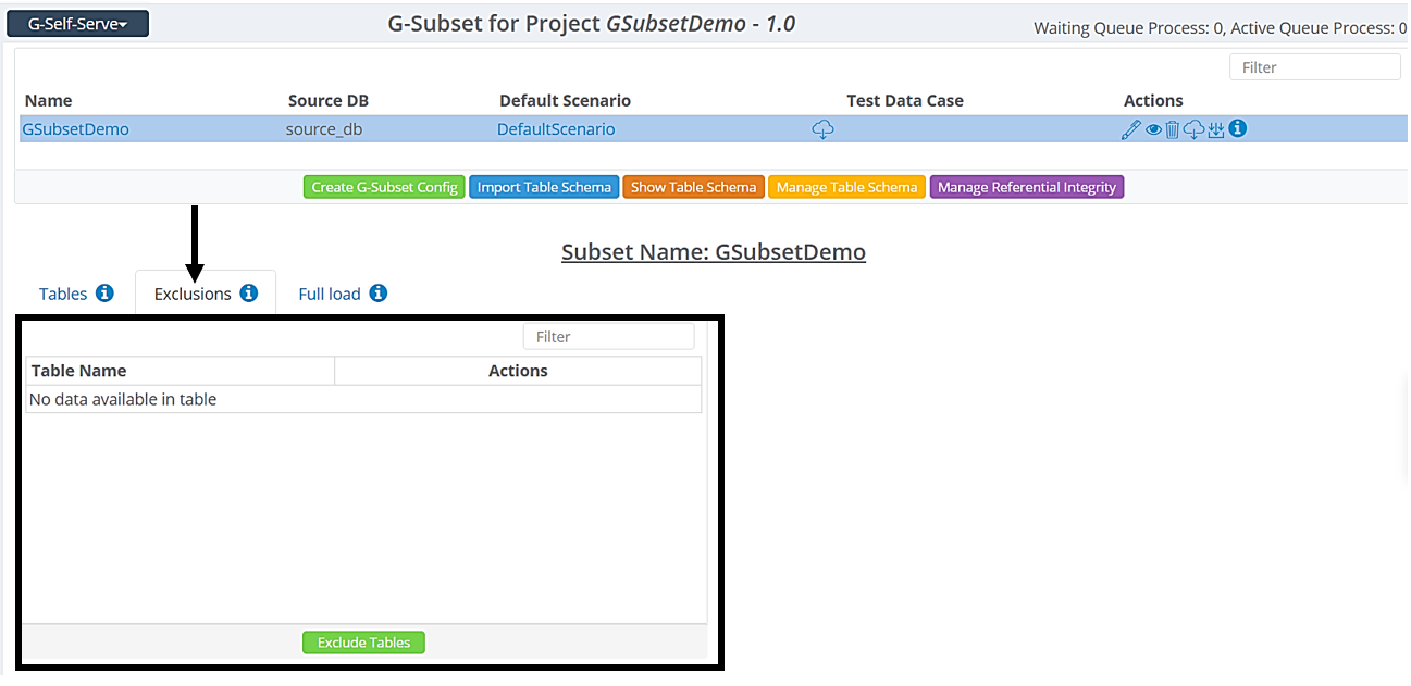 The Exclusions Tab is used to exclude any tables that were part of the schema but should not be part of data subsetting.