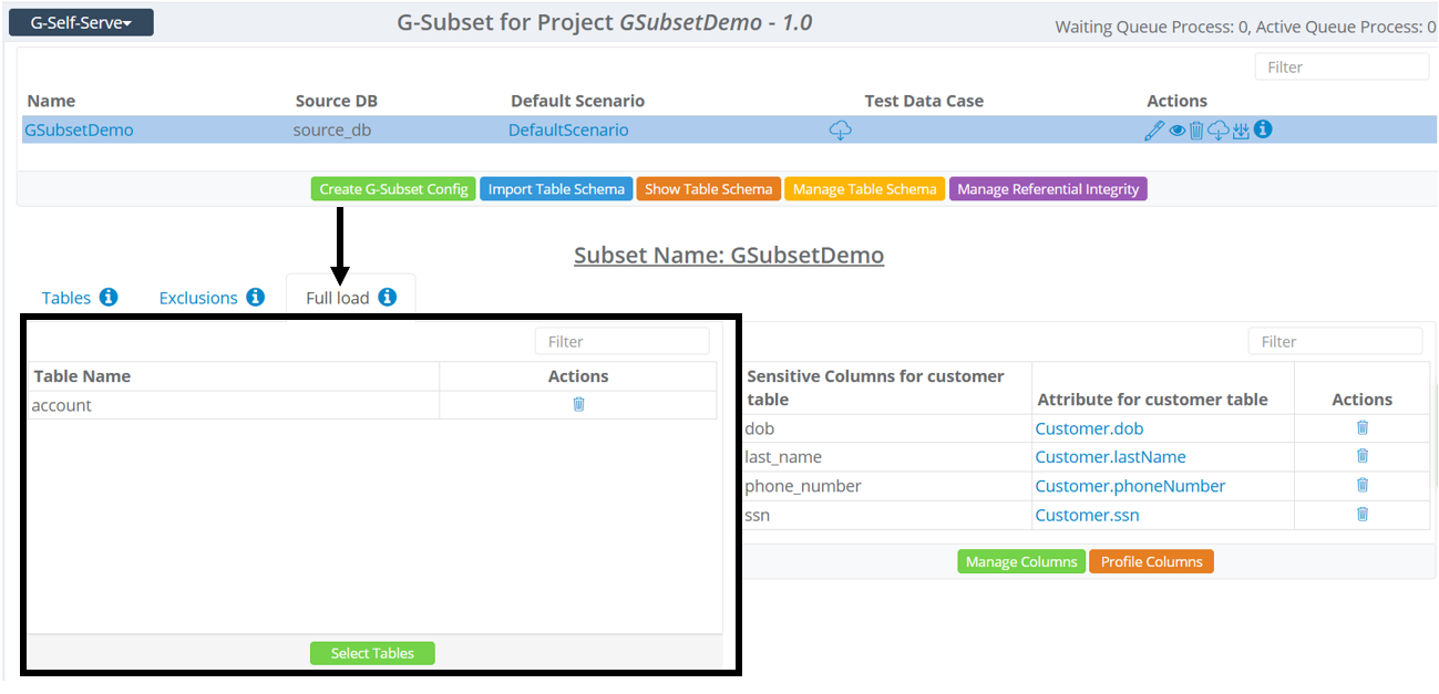 The Full Load Tab can be used to select one or more tables for a full load (i.e., migration) during subsetting.