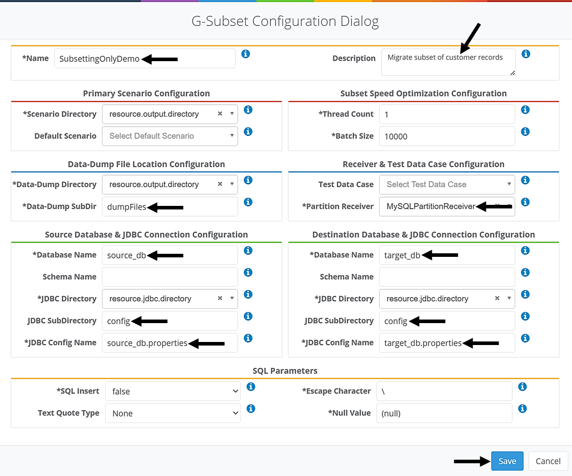batchCount=1000Note: Please note that 'root' has been entered for the user name and password information. The user will need to use each database's actual user and password information.