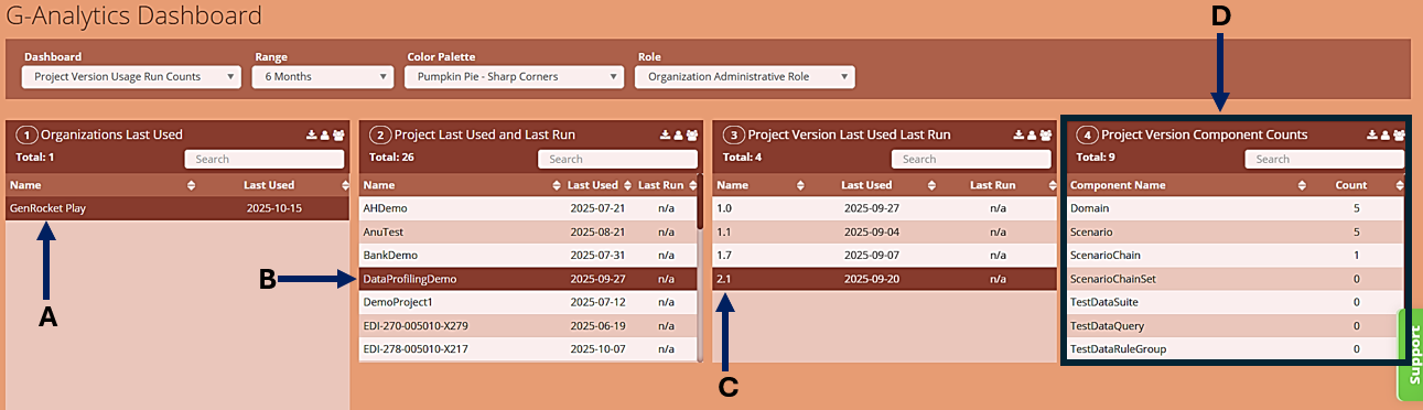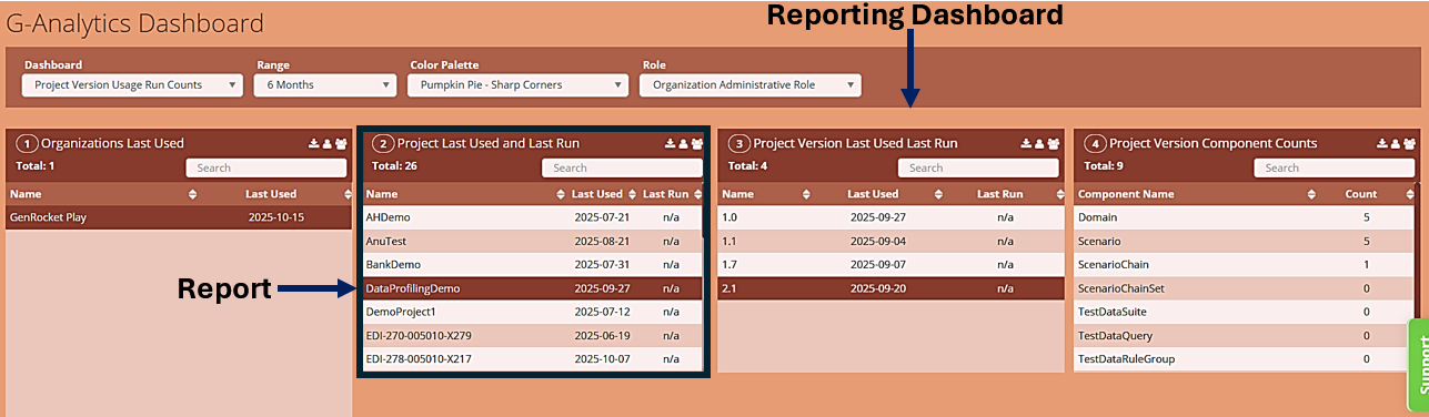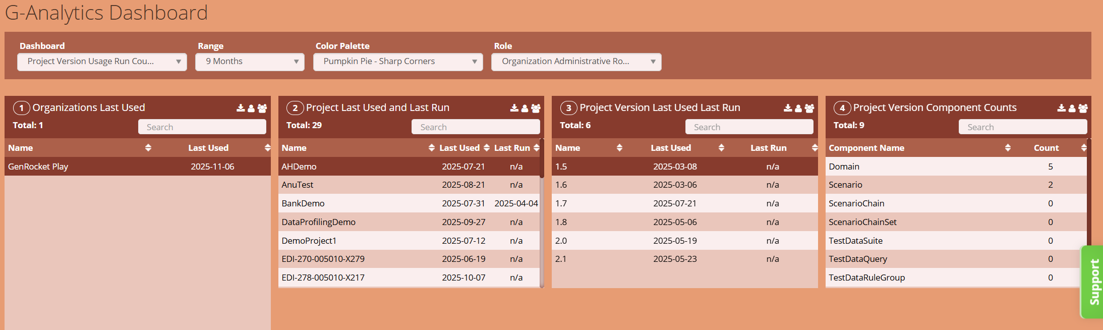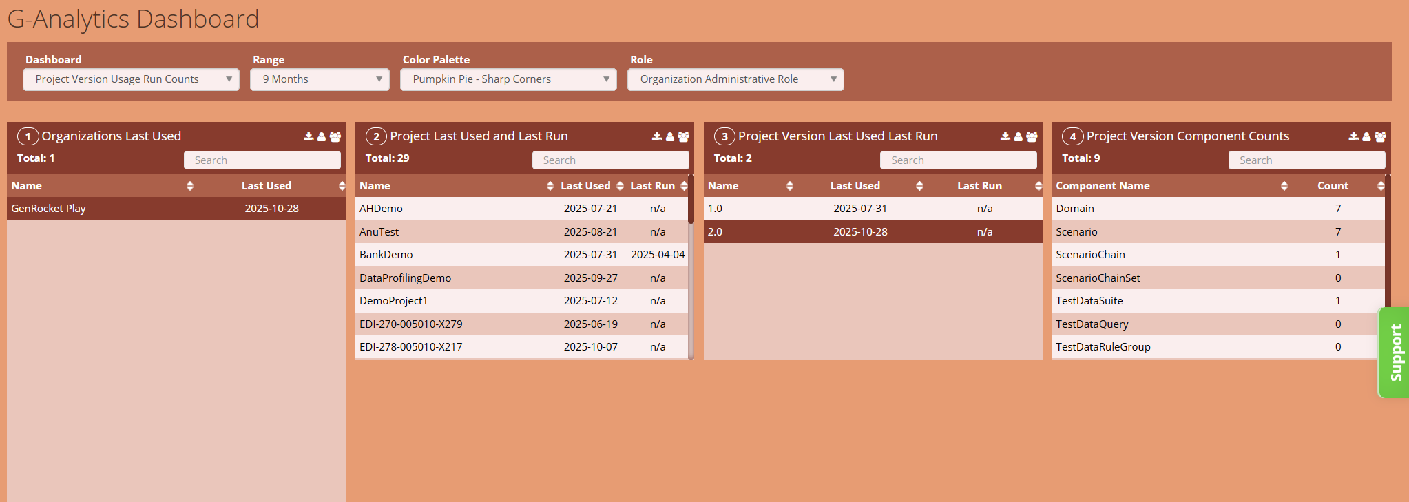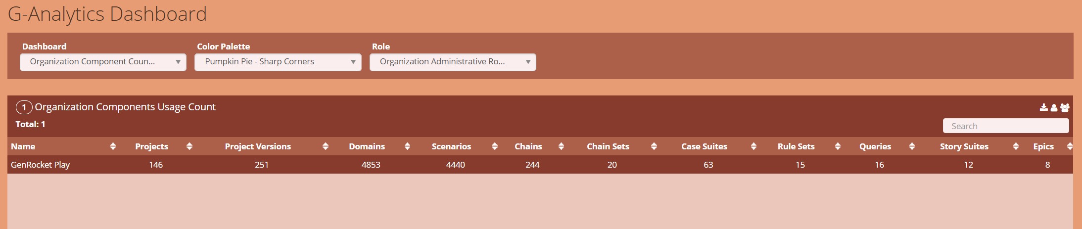 G-Analytics is designed to provide clear, role-based insights into how the GenRocket platform is being used. Whether you are monitoring organizational trends, tracking project activity, or reviewing detailed testing statistics, the dashboards present complex data in an accessible and practical format for a wide range of users.