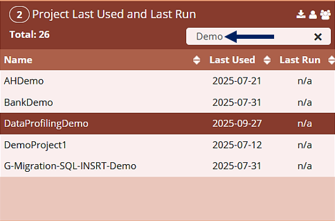 | 2 | Project Last Used Last Run | Last used and run date of all projects for a selected organization. |
