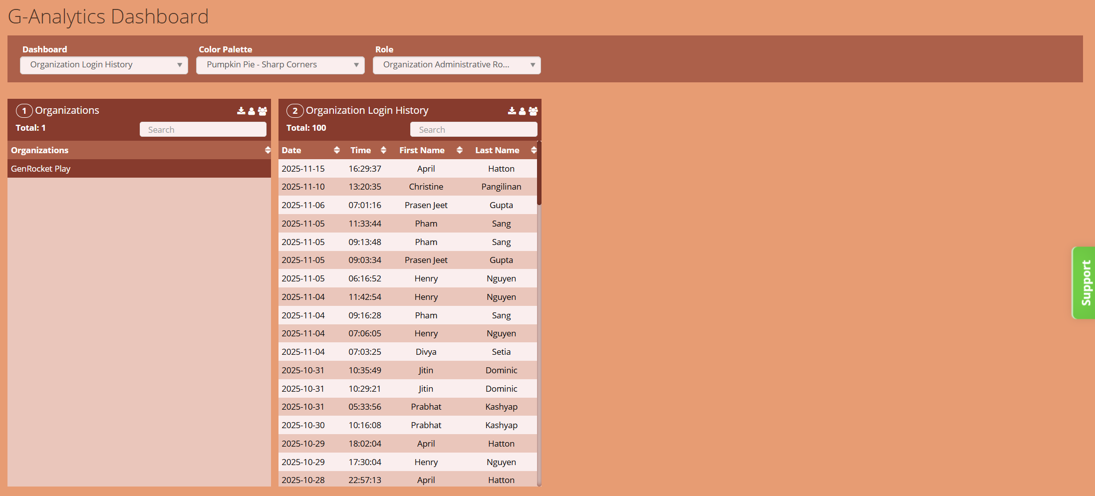 - Organization Admin Role – Users assigned this role can view all six currently available dashboards in G-Analytics.