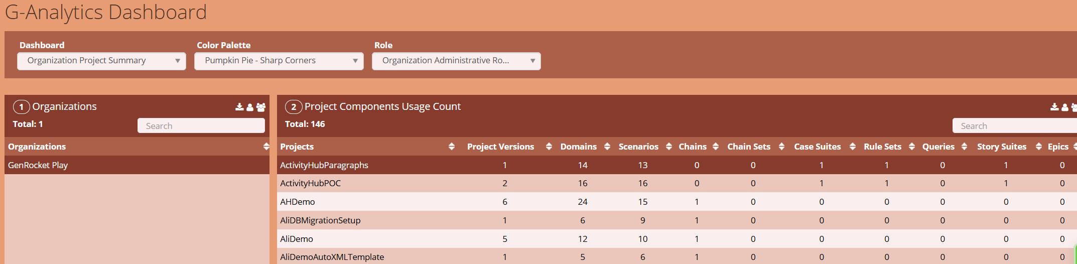 Displays each accessible organization and the component usage counts for each project within that organization. The displayed data includes the numbers of Project Versions, Domains, Scenarios, Scenario Chain Sets, G-Cases, G-Rules, G-Queries, Stories, and Epics.