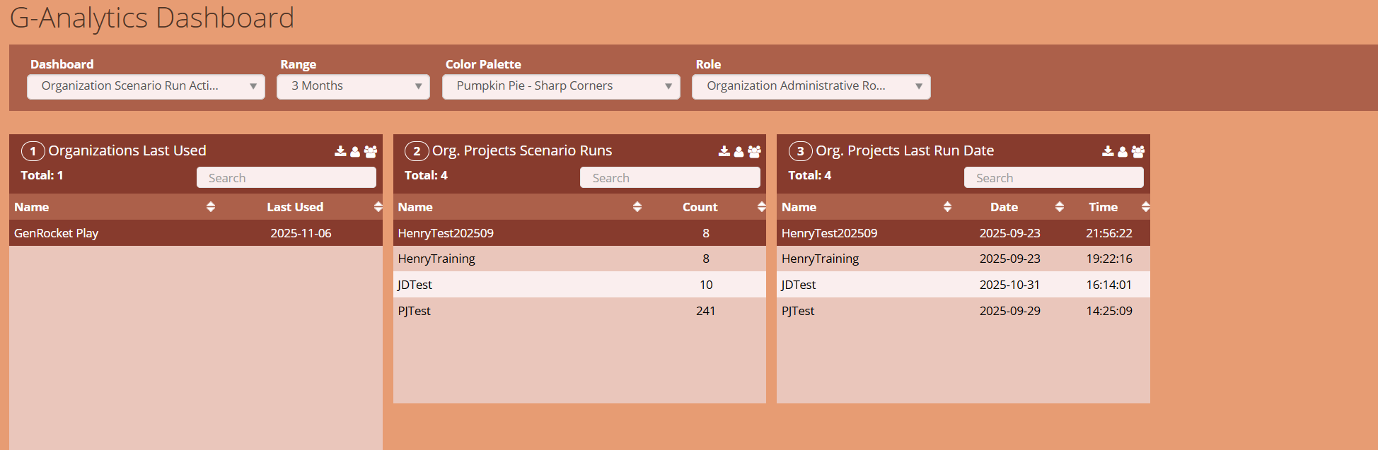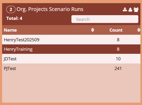 | 2 | Org Projects Scenario Runs | Displays Projects of a selected organization that had a Scenario run, and how many times each project has been run. |