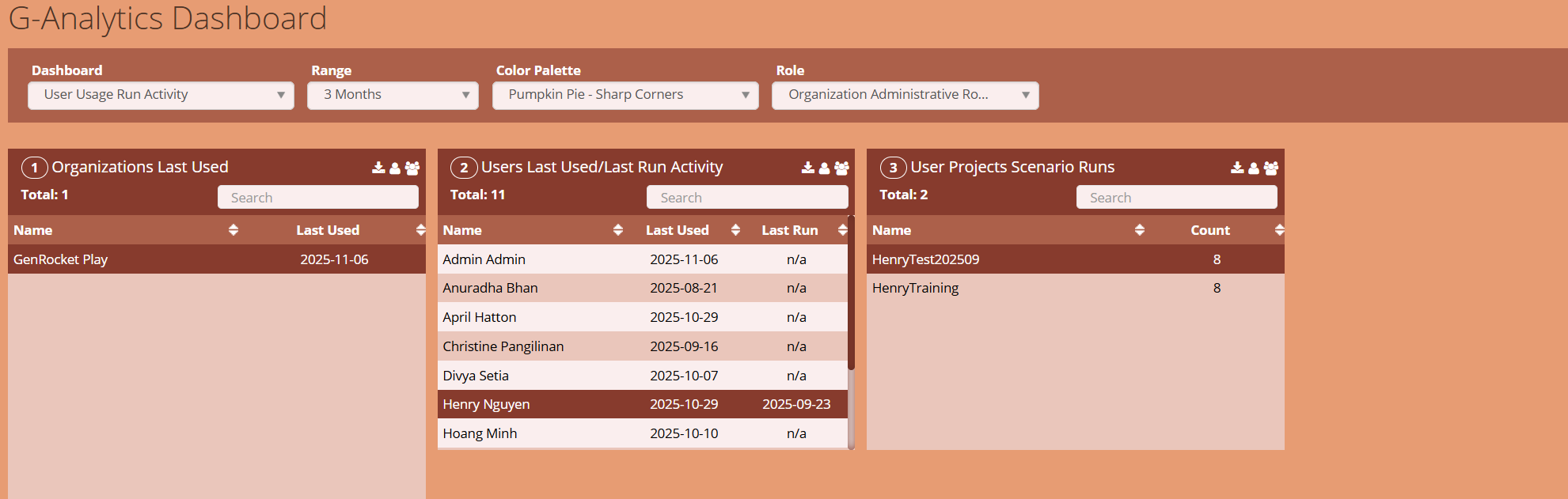 | 3 | User Projects Scenario Runs | Shows projects of a selected organization and how many times each project has been run by the selected user. |