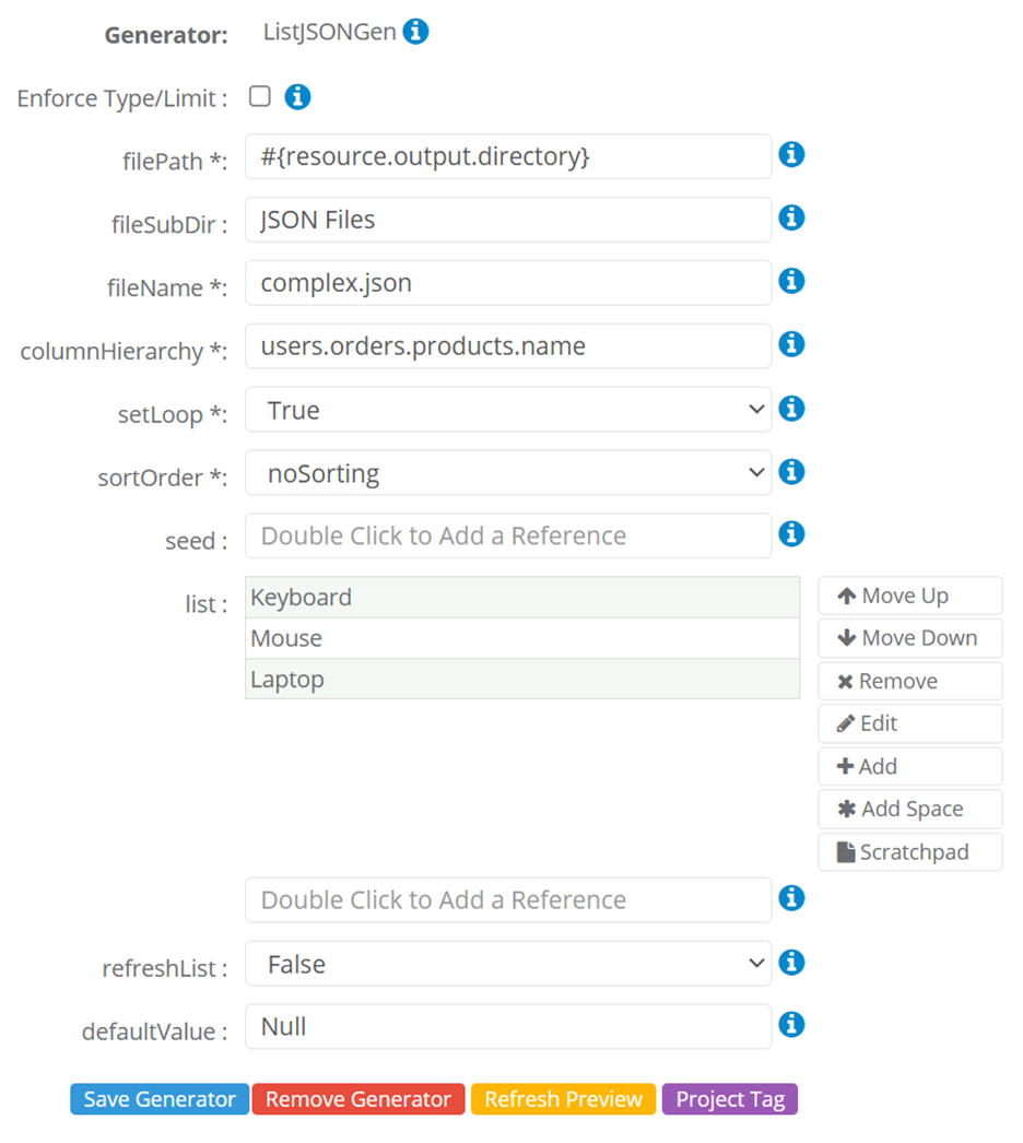 - refreshList - Allows for dynamic reading of file names. Determines whether the list of file names is refreshed (updated) each time the GenRocket Engine processes a Child Domain (a related data structure) during an iteration. It is set to 'false' by default. When 'true', the ListJSONGen will grab the next file each time a Child Domain is encountered.