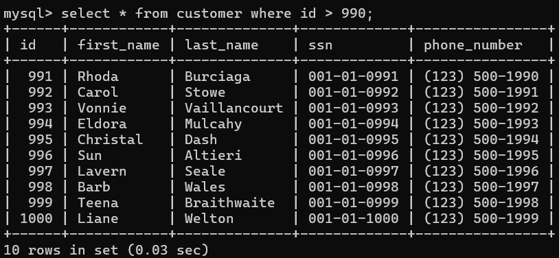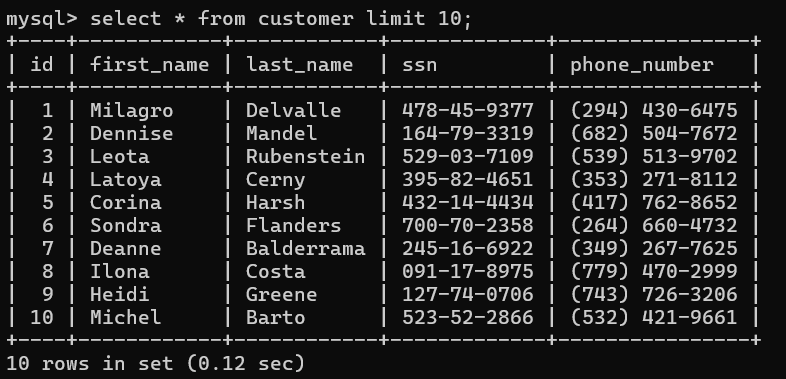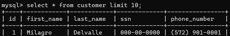 - Contains a Customer table and five fields (id, first_name, last_name, ssn, and phone_number)
