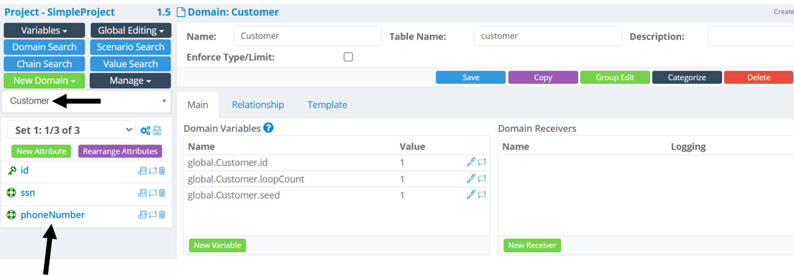 Create a Domain for each table and only include the Attributes for the columns that contain sensitive data. For this example, we have created a Customer Domain with an ssn and a phoneNumber Attribute.