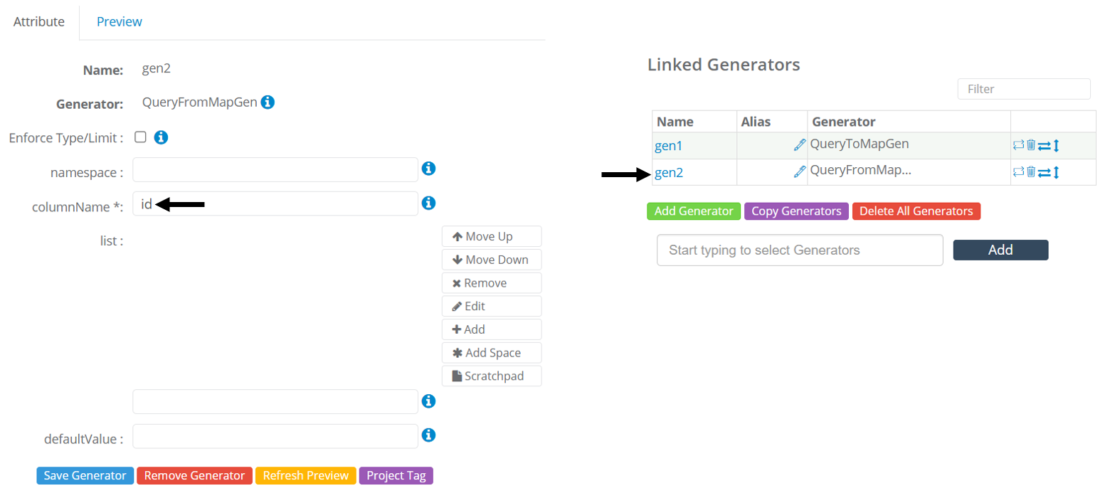 Next, assign the QueryFromMapGen Generator to the id Attribute. You can do this by Linking Generators. This Generator maps the id column used in the QueryToMapGen query parameter (Step 2).
