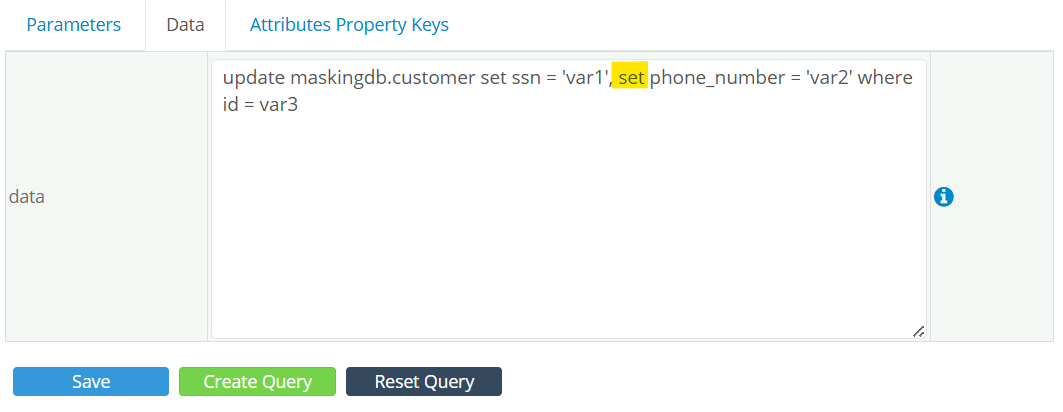 Select the Data tab and enter the SQL Update Statement. Each Attribute included in the update statement is assigned a variable value ranging from var1 to var20. Enter the Update Statement and click Save. In this example, the assigned variable values are: