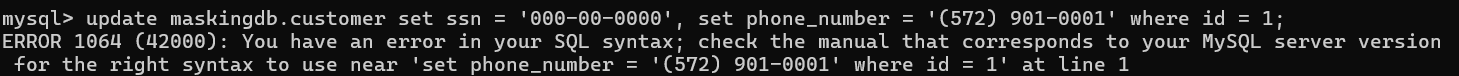 Please note that the syntax of the update statement will vary based on the database type and version. This example is for MySQL 5.7. If the syntax is wrong, you will receive an error. The error and troubleshooting recommendations are shown later in this article.