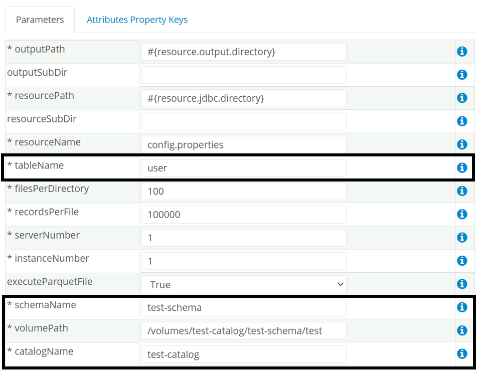 - Specifically, the tableName , schemaName, catalogName, and volumePath.