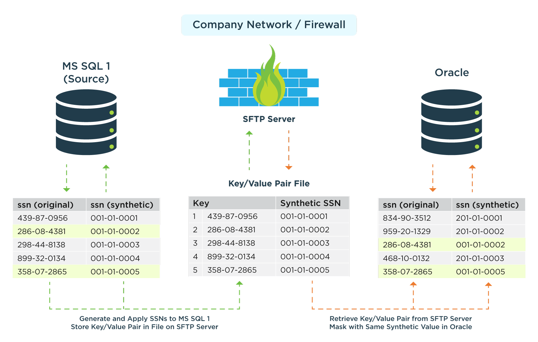 - Simplified Data Consistency Handling - ensures consistent masking for records lacking mapped values in a source by utilizing pre-generated synthetic values stored in a bucket, maintaining deterministic results across runs without requiring centralized coordination.